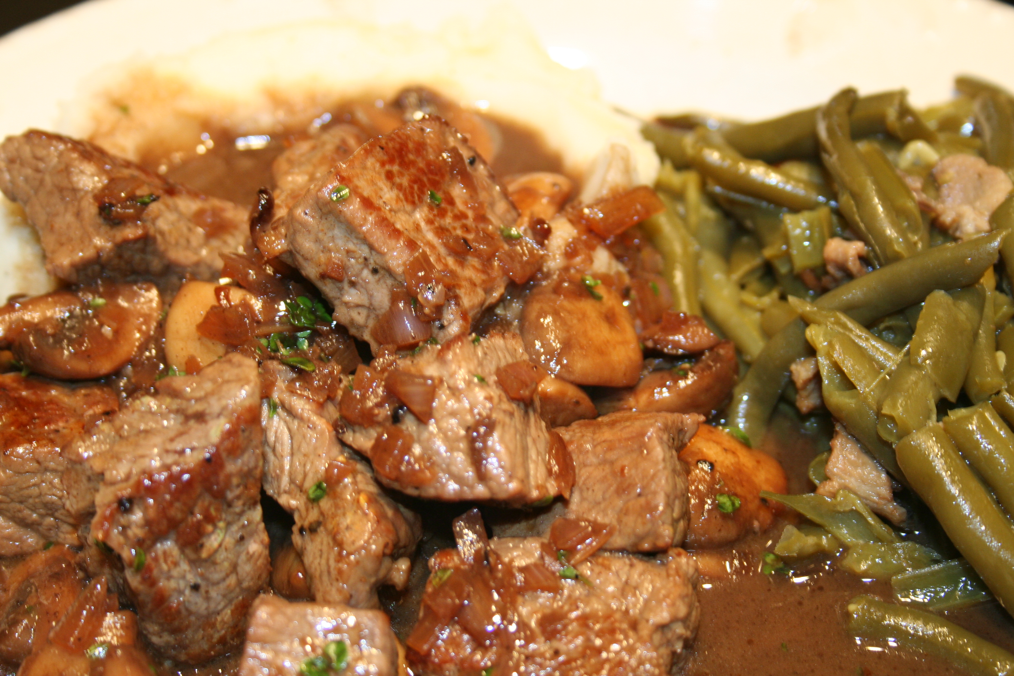 5. Finish & Serve: Add steak tips and any accumulated juices to pan and toss to coat. Serve hot with mashed potatoes, pasta or rice, if desired. Enjoy!