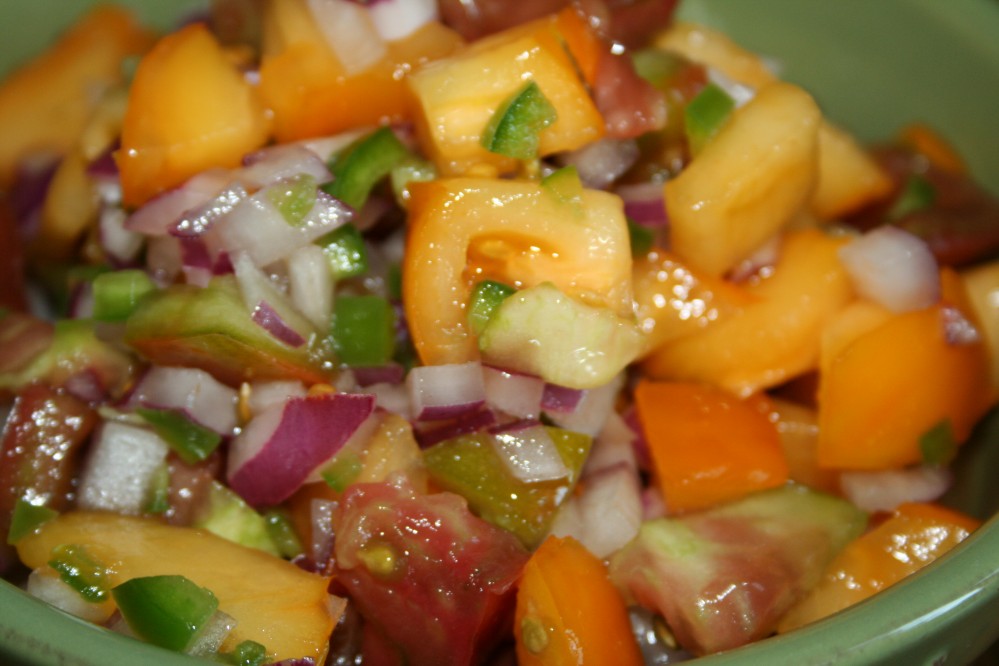 Photo of salsa with heirloom tomatoes, jalapeno, onion and lime.